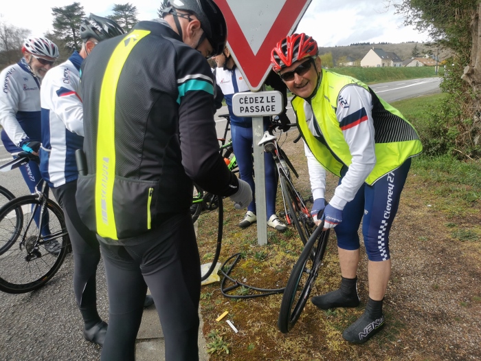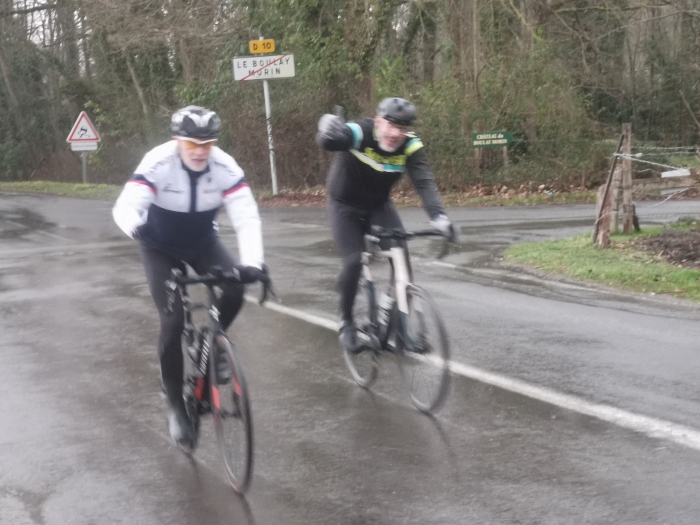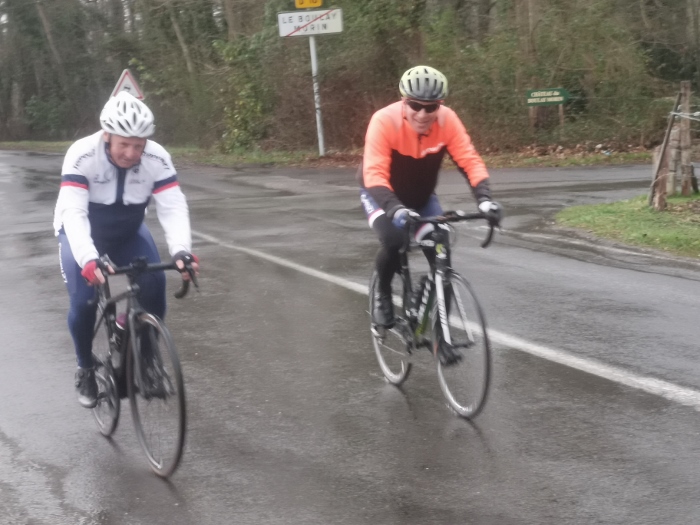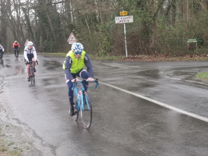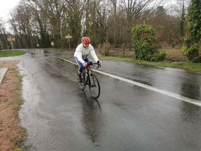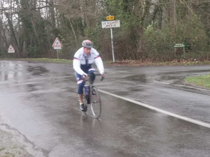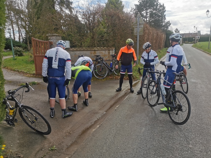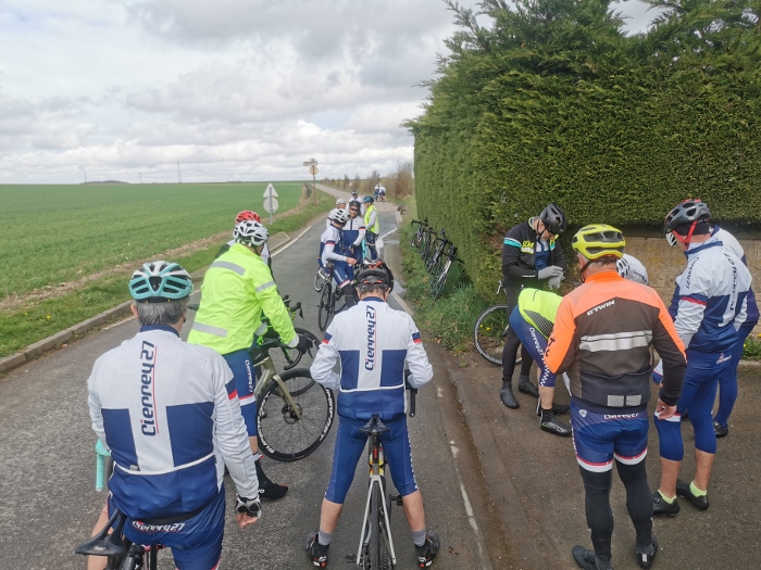 Ce samedi une vingtaine de participants au traditionnel premier 100 kms de début de saison avec un bon 15 degrés et..... du soleil... Bon nombre d’entre nous étions rassurés et les discussions sur une certaine hésitation due aux pluies incessantes de la matinée ont animé le rassemblement du départ. Les routes restant bien humides n’ont pas épargné Jacky qui a réparé une première crevaison en venant à Cierrey nous rejoindre.... Puis une deuxième à la sortie de Sassey peu après notre départ... Les premiers kms on été parcourus à bonne allure...Le cyclisme est un sport difficile mais évidement plus facile avec le vent de dos.... Ce qui fut le cas sur les 60 premiers kms.... Un peu arrêtés à l’entrée d Acquigny car William a sorti les outils de réparation et la pompe, à son tour, victime d’une crevaison ! Le vent, encore bien présent et de face cette fois, à bien ralenti le groupe dès le haut de la première "bosse" en direction de la Haye Malherbe et Montaure . À signaler tout de même une belle chute mais heureusement sans gravité sur un rond point de notre ami Pascal..... C’est le métier qui rentre..... Comme on dit... Le retour se passait sans encombre, mais c’était sans compter sur dame nature qui nous a joué un vilain tour en nous envoyant un énorme orage et de fortes pluie assombrissant l’horizon et surtout en nous transpersant d’eau malgrés les protections de chacun pendant les 20 derniers kms. Bertrand se retrouvant avec une belle "piquette" aux mains quelques kms avant notre arrivée, finalement nous avons fini tous bien mouillés mais contents d’avoir fait ce 100kms... Bon dimanche à tous.