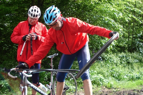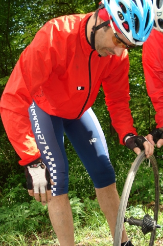 Qui dit pluie dit crevaisons, en fin de parcours notre grand Thierry n’y échappa pas et en plus roue avant et roue arrière en même temps, Titi en profita pour demander de lancer une souscription en faveur de Thierry pour acheter des pneus (lol).