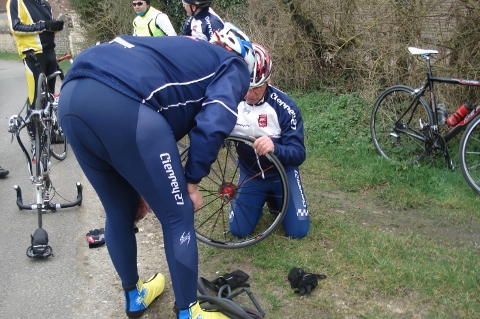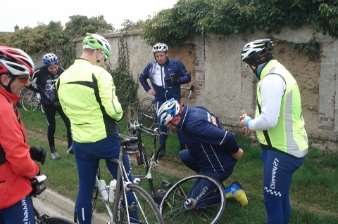 Nous étions un beau groupe de 21 cyclos, complété par Karine venu à notre rencontre, Alain venu également à notre rencontre aurait dû aussi compléter le groupe, mais n’ayant pas pris en considération dans son timing les deux crevaisons de Philipe R a roulé seul devant nous.