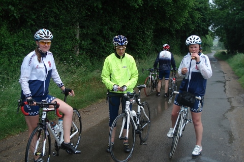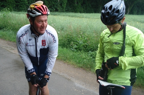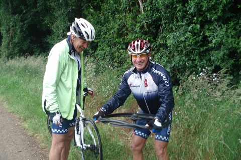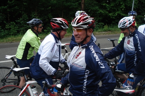 Dimanche matin deux groupes, un de onze sur le parcours ‘’normal’’ et un autre groupe de 6 toujours emmené par notre ami Christian sur ce même parcours de bosses. Sans le vouloir les deux groupes se sont salués en bas de la cote du Haut Croisy. La fête a été gâchée par la pluie, le groupe de 11 décida de rentrer au plus court après 3 crevaisons.