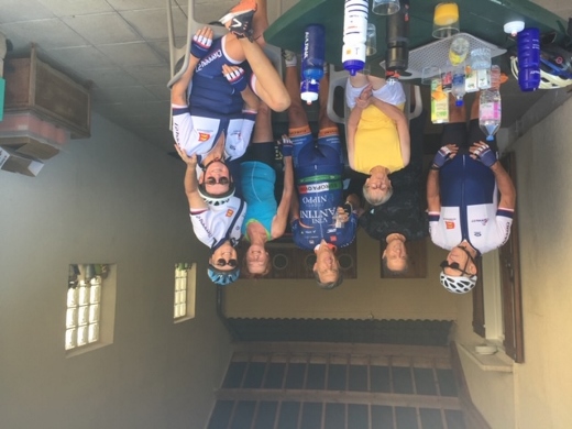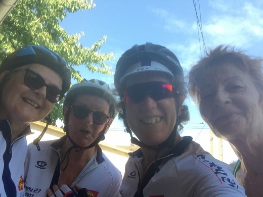 J’en entends dire que nous les filles on n’est jamais contentes sur notre vélo hihi ! Mais siiiii aujourd’hui on était tout de même très contentes car cette sortie féminine où nous étions 5 s’est transformée en sortie mixte où nous sommes devenus 7. Bertrand nous a fait l’honneur de rejoindre nos rangs ainsi qu’un copain des gars dont j’ai oublié le nom mais vous le reconnaîtrez facilement sur la photo c’est celui qui ne portait pas de casque (pas bien monsieur !)